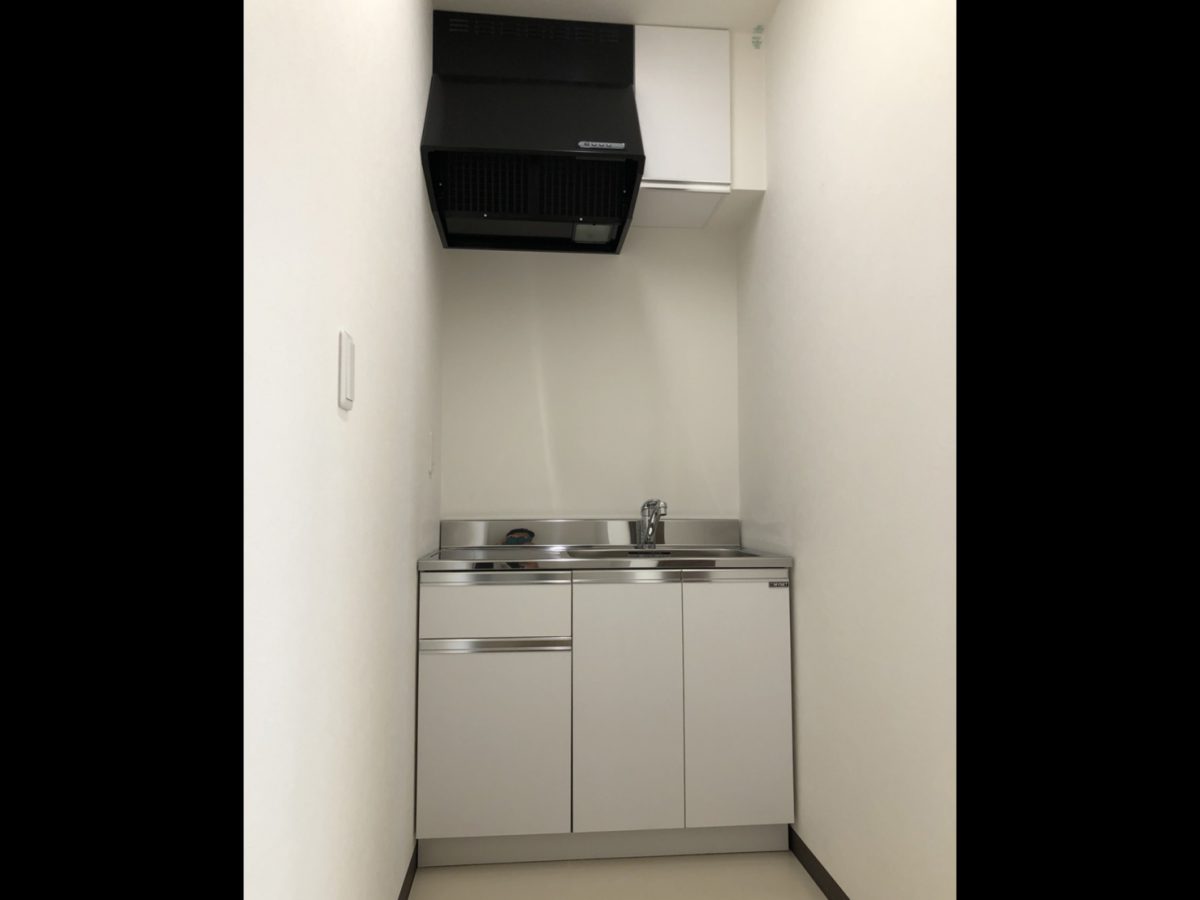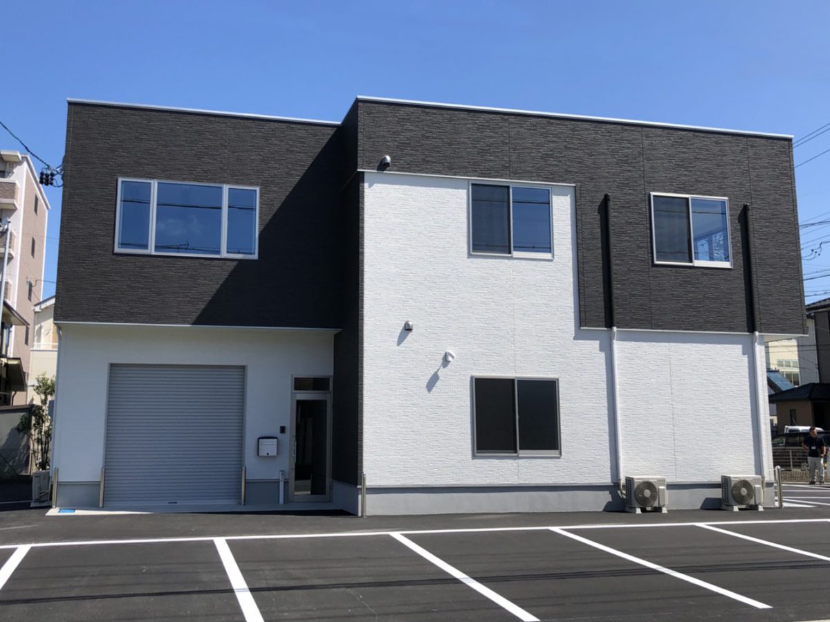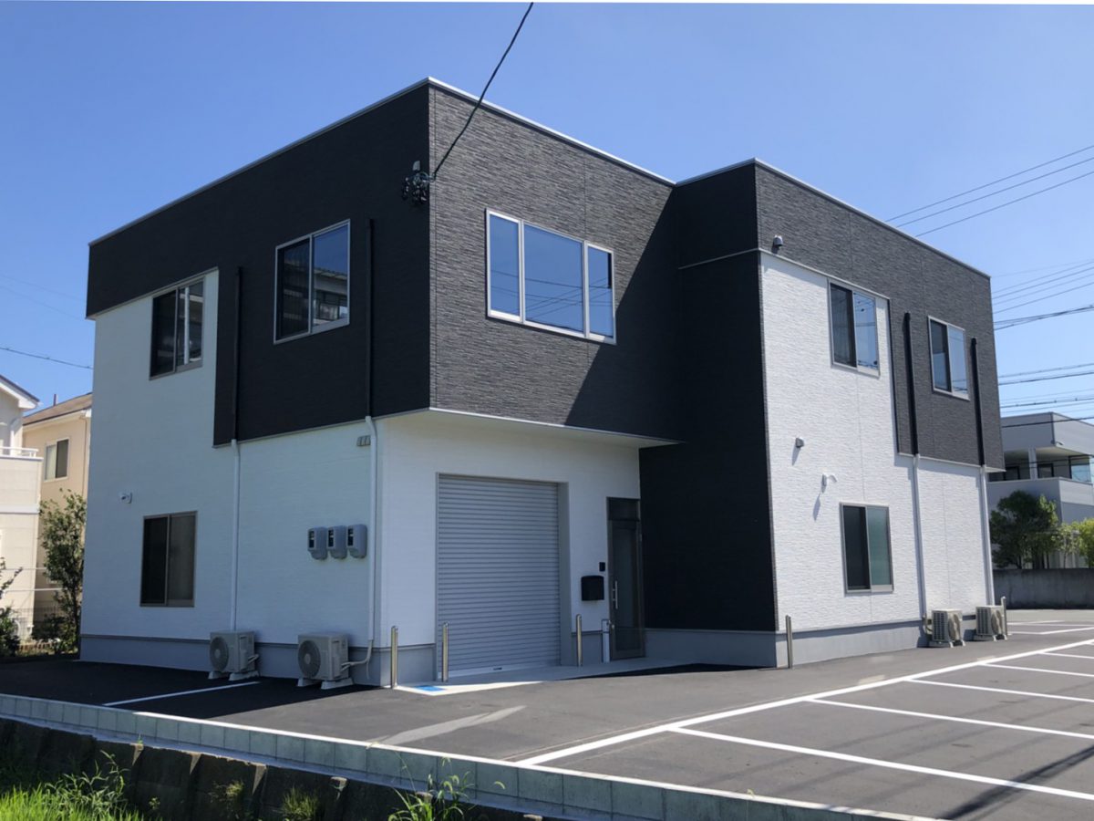 1階が倉庫、2階を事務所としてお使いいただける貸事務所です。外観は白と黒でシックな色使いで、事務所部分は白色の壁紙と木目調の建具でシンプルに構成されています。給湯室とトイレも完備しています。