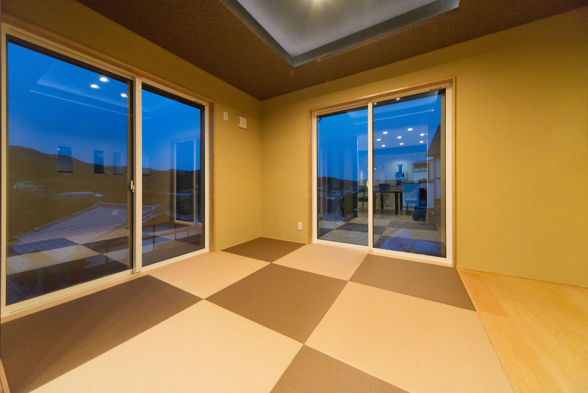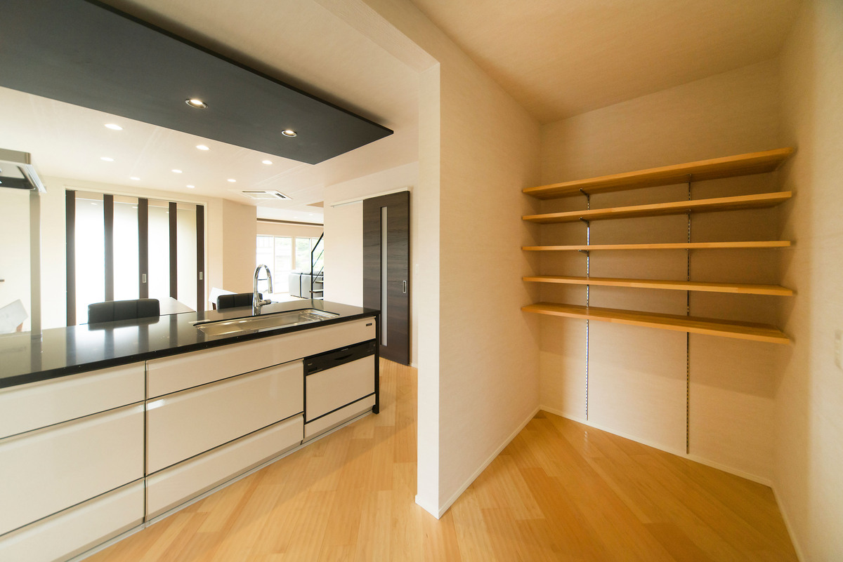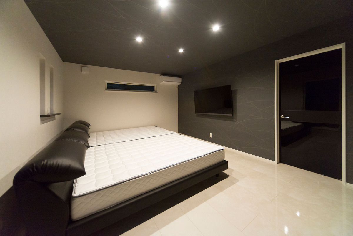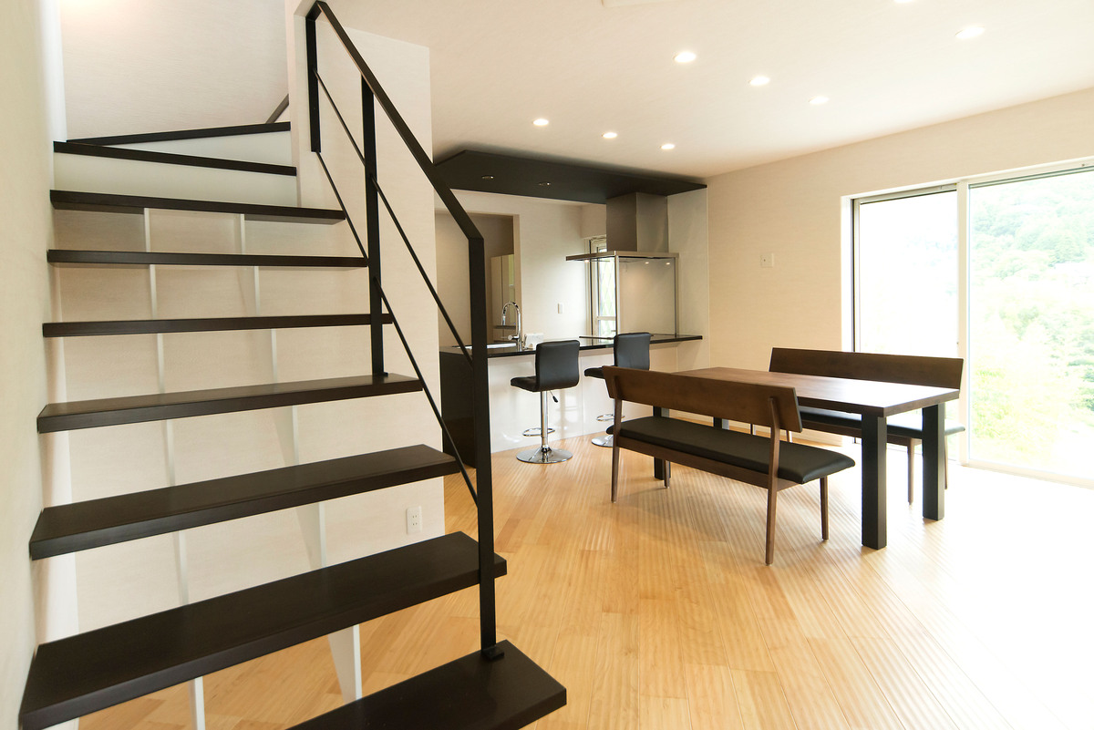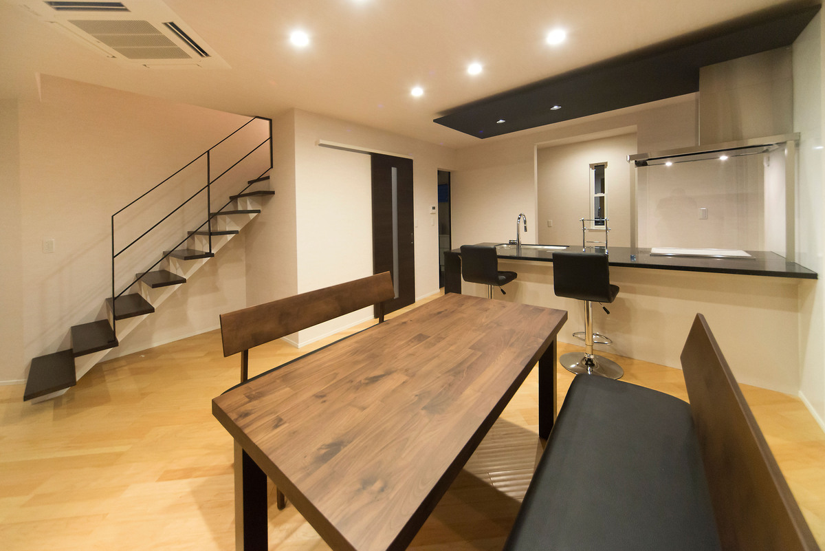 長年、数々の新築住宅を手がけてきた大工自身が、細部までこだわり抜き一切の妥協を許さず、今まで積み重ねてきた理想を形にした住宅です。リビング・ダイニングは洗練されたイメージに統一し、ダイニングに併設された和室には琉球畳を採用し和モダンな雰囲気に。重くなりがちな階段はアイアンの手すりと木材の踏み板のみで開放感を出しています。2階の居室はラグジュアリーな寝室と、白色で統一された部屋、梁をデザインに取り入れたフローリングの部屋を備え、家中の至るところにこだわりが盛り込まれています。