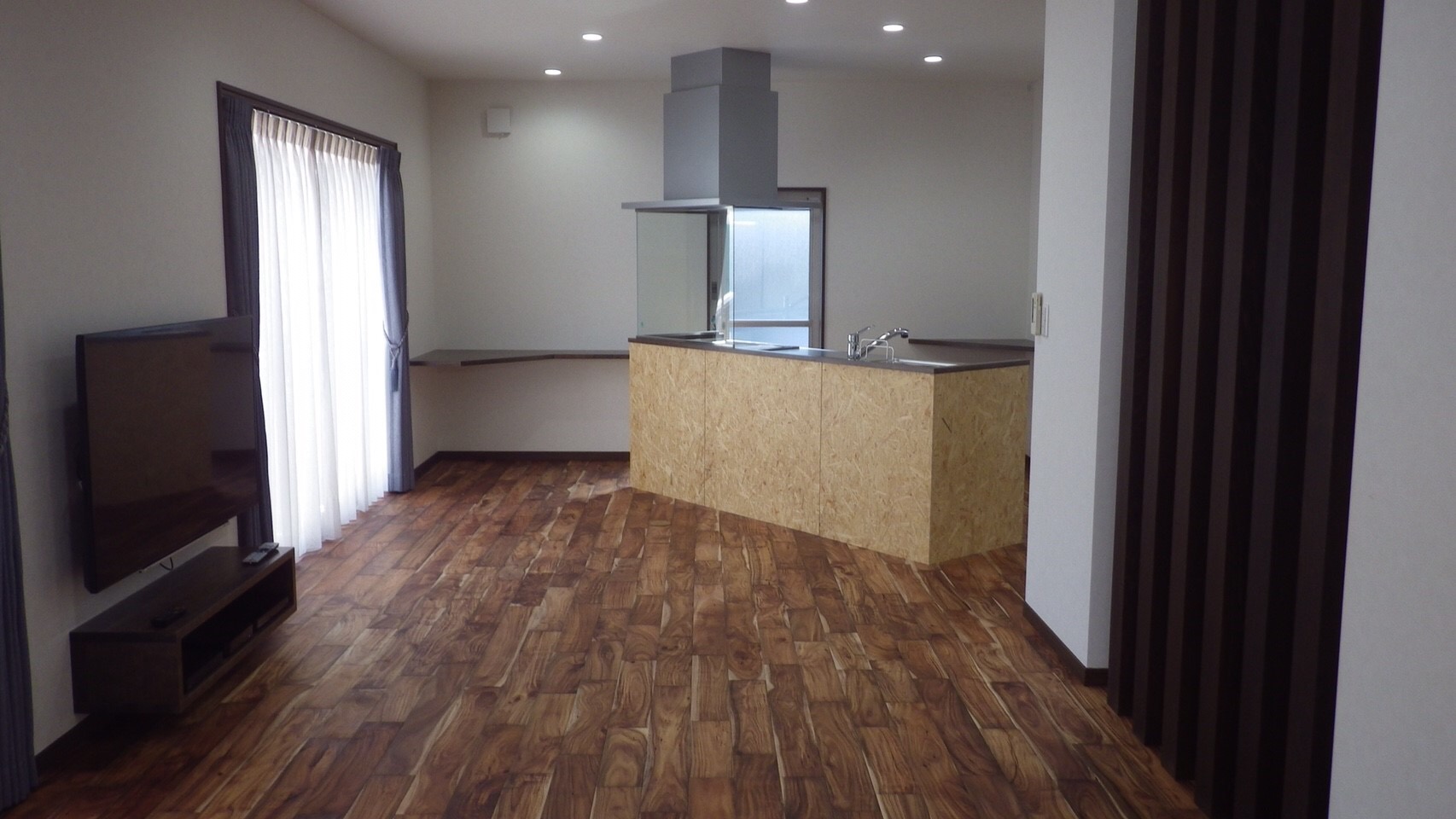 随所に奥様のこだわりがカタチとなっているU様邸では、キッチンをカフェ風オープンキッチンにすることでリビング全体を見渡すことができ、家事をしながらでも小さなお子様から見守ることができます。家族のみなさんが安心して暮らしていける奥様こだわりの仕上がりとなりました。