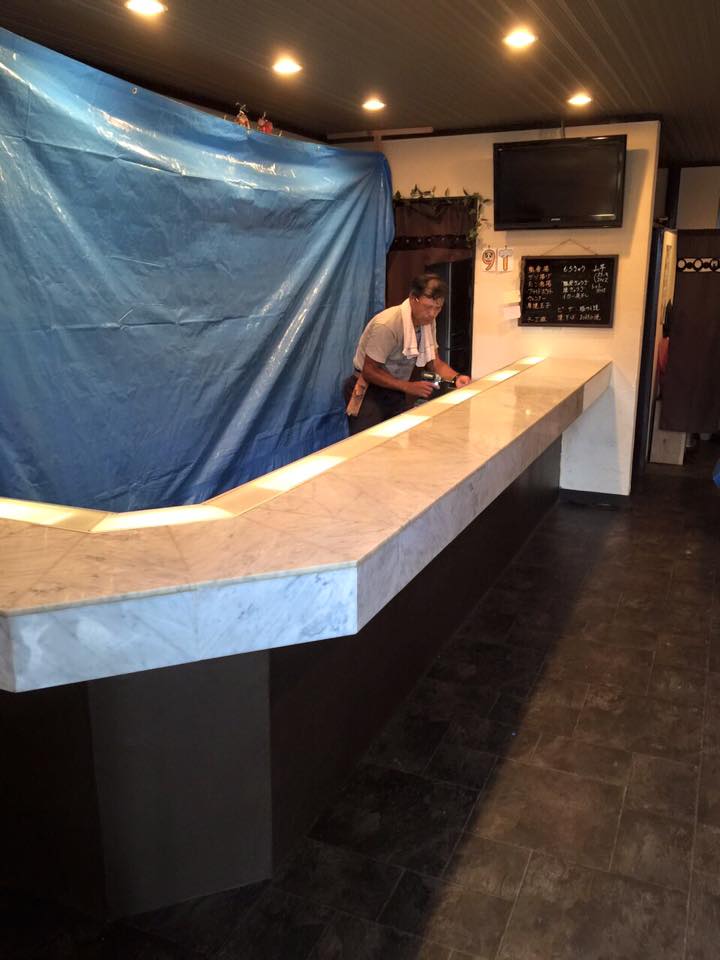 葵東にある飲食店「花音」様のカウンターを改装しました。1枚目の画像が改装後、2枚目が改装前です。優雅な雰囲気だった大理石調のカウンターを、2種類の色調で変化をつけた木製のカウンターに変更し、落ち着いた雰囲気になりました。